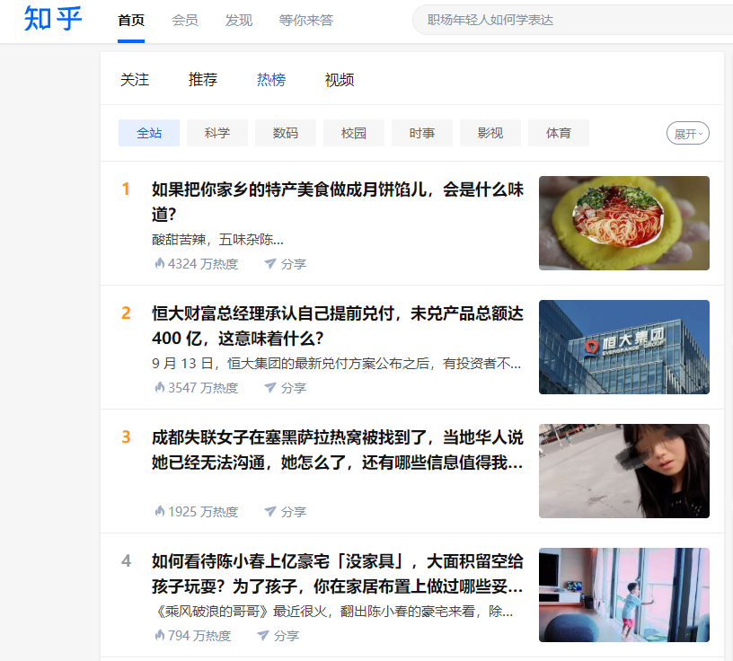 知乎值得一看的板块有很多,首先当然是实时更新的热榜话题,分享了最近讨论热度非常高的问题,并且可以按照科学、数码、影视等不同领域来筛选喜欢的内容。