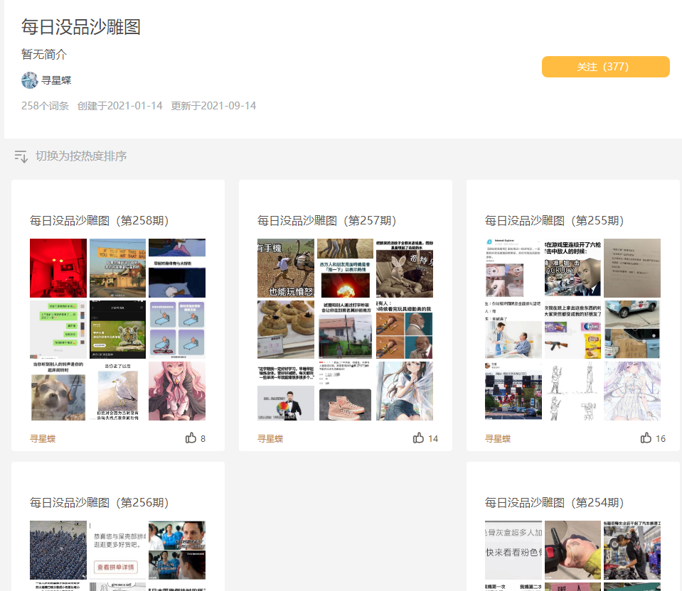 网站还有一些每日沙雕图、动漫名言之类的专辑,收藏了相同主题的一系列词条。