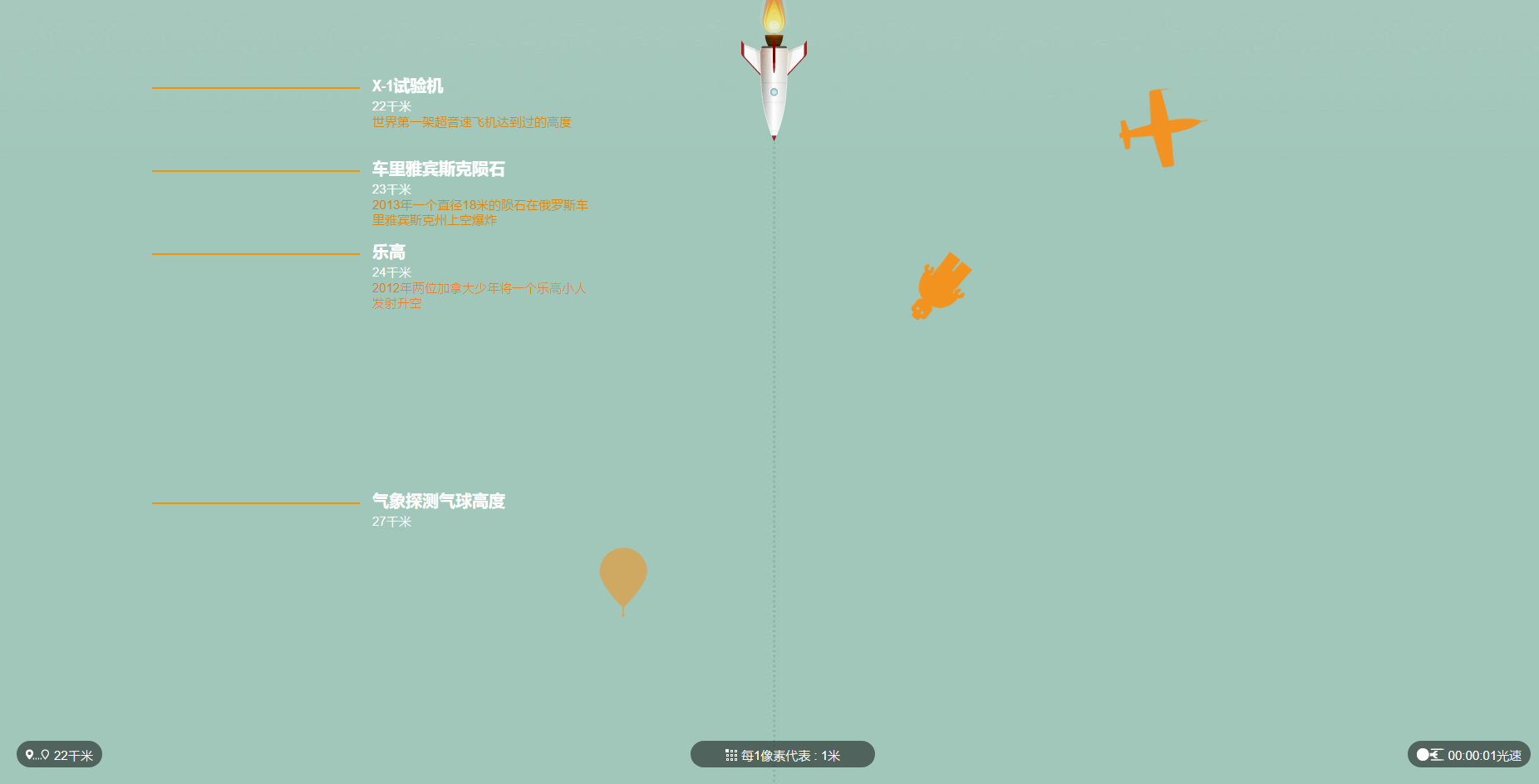 这是一个兼具科普功能的小游戏,我们可以操纵一个小火箭从地面发射起飞,然后飞往更高的天空,途经一个个不同的高度标尺。