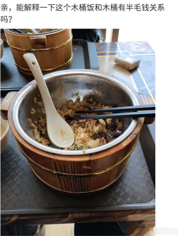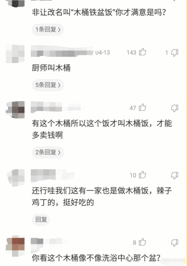 网友们的评论也是让人哭笑不得啊,还不如叫“木桶铁盆饭”算了,小伙伴们,你们喜欢吃这木桶饭吗?